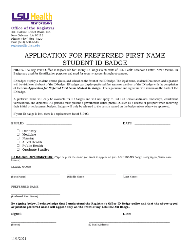 Get the free Application for Preferred First Name Student ID Badge - LSU Health ...