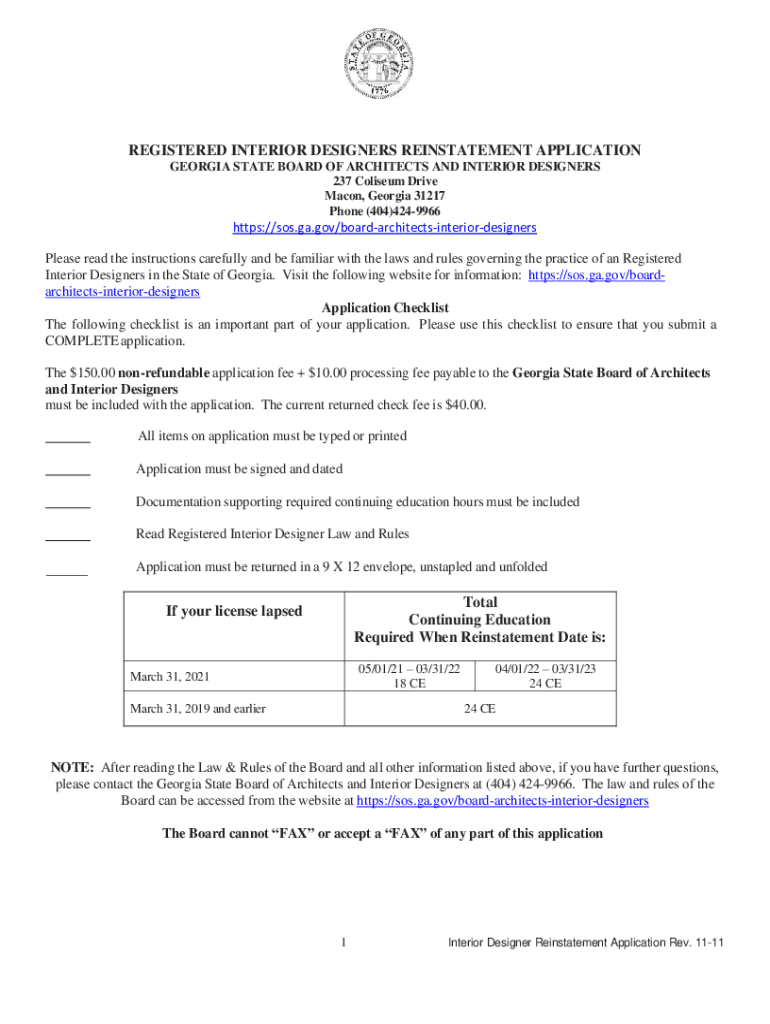 REGISTERED INTERIOR DESIGNERS REINSTATEMENT APPLICATION GEORGIA STATE BOARD OF ARCHITECTS AND INTERIOR DESIGNERS 237 Coliseum Drive Macon, Georgia 31217 Phone (404)4249966https://sos.ga.gov/boardarchitectsinteriordesignersPlease