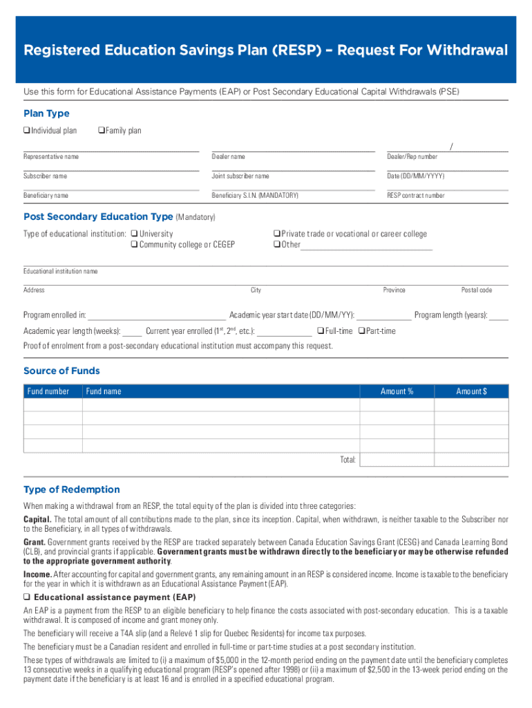 Registered Education Savings Plan (RESP) Request For Withdrawal Use this form for Educational Assistance Payments (EAP) or Post Secondary Educational Capital Withdrawals (PSE)Plan Type Individual