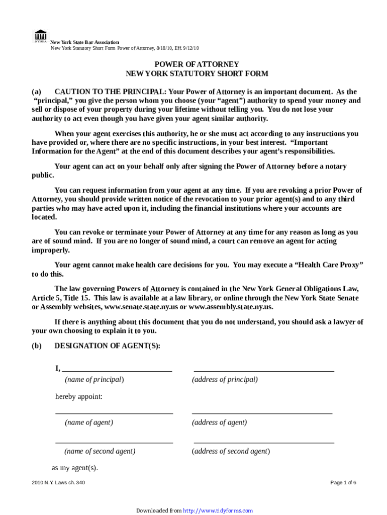 New York State Bar Association New York Statutory Short Form Power of Attorney, 8/18/10, Eff. 9/12/10POWER OF ATTORNEY NEW YORK STATUTORY SHORT FORM (a) CAUTION TO THE PRINCIPAL: Your Power of Attorney
