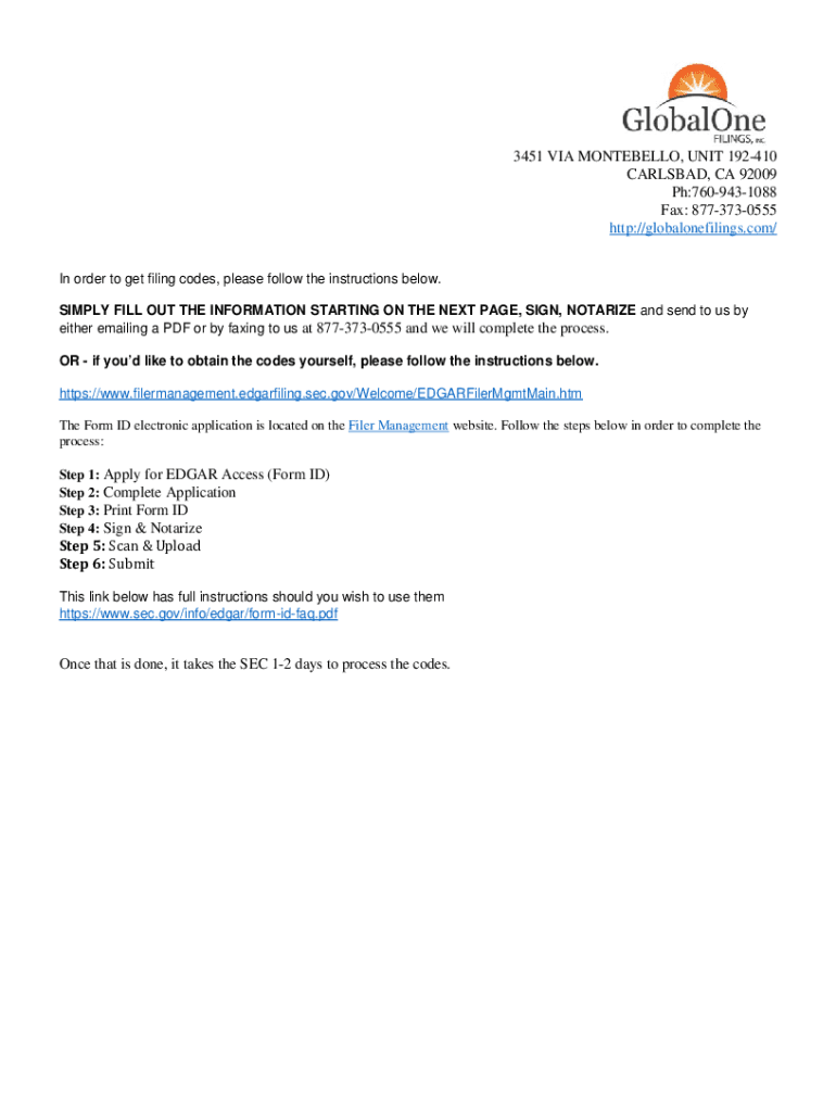 3451 VIA MONTEBELLO, UNIT 192410 CARLSBAD, CA 92009 pH:7609431088 Fax: 8773730555 http://globalonefilings.com/ In order to get filing codes, please follow the instructions below. SIMPLY FILL OUT THE