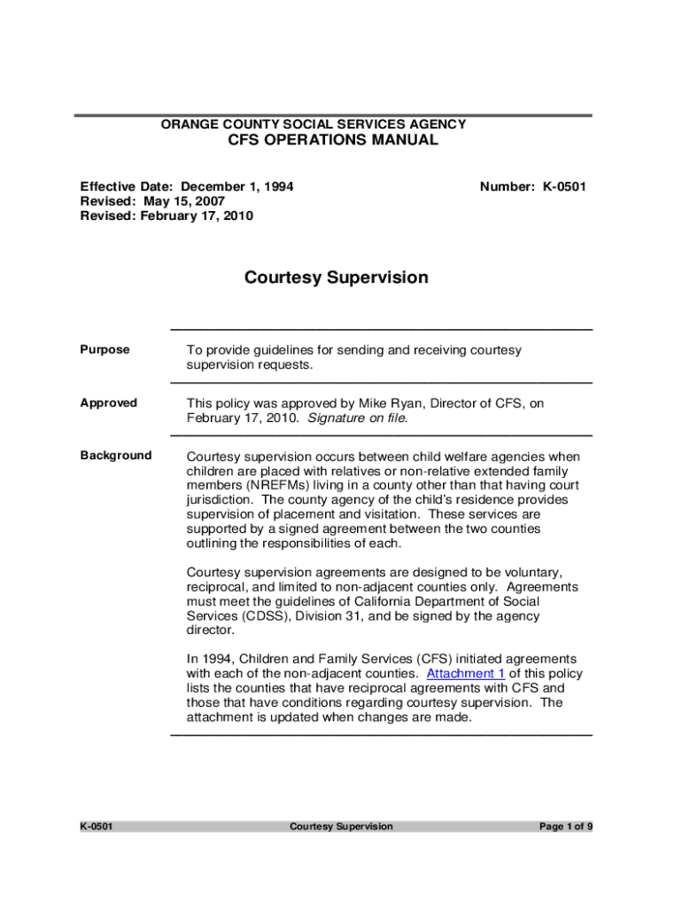 ORANGE COUNTY SOCIAL SERVICES AGENCY CFS OPERATIONS MANUAL Effective Date: December 1, 1994, Revised: May 15, 2007, Revised: February 17, 2010Number: K0501Courtesy Supervision ___Purpose provide guidelines