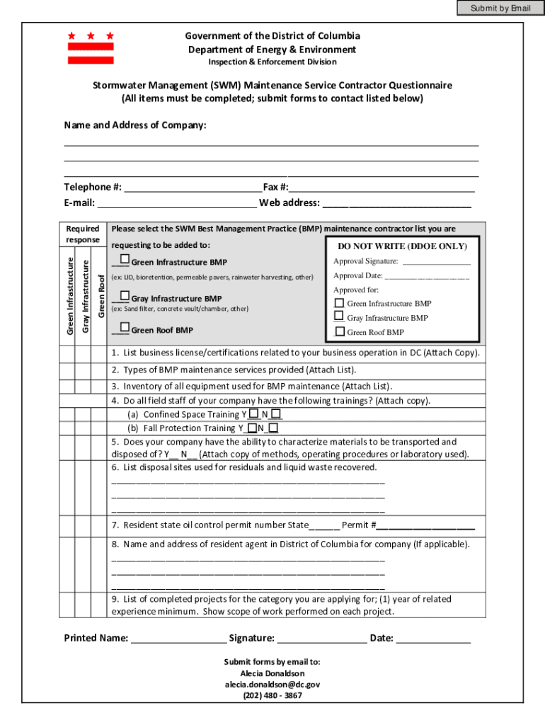Submit by Misgovernment of the District of Columbia Department of Energy & Environment Inspection & Enforcement DivisionStormwater Management (SUM) Maintenance Service Contractor Questionnaire (All