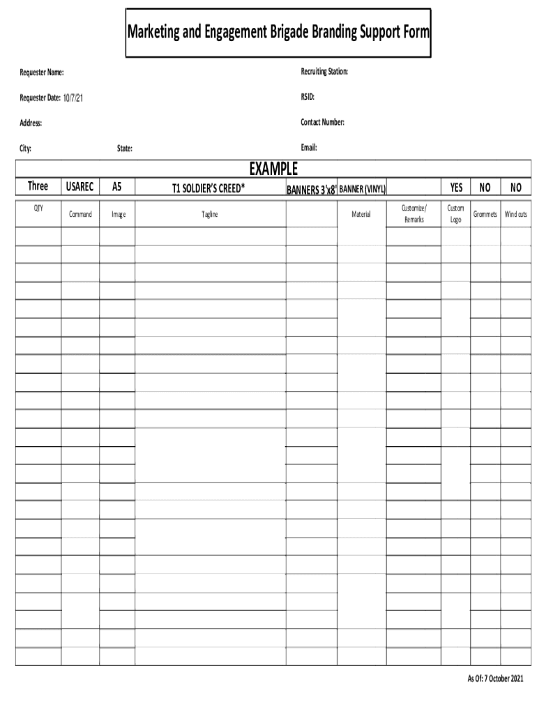 Marketing and Engagement Brigade Branding Support Form Requester Name:Recruiting Station:Requester Date: 10/7/21RSID:Address:Contact Number:City:State:ThreeUSARECQTY (Spelled Out)CommandA5 ImageT1