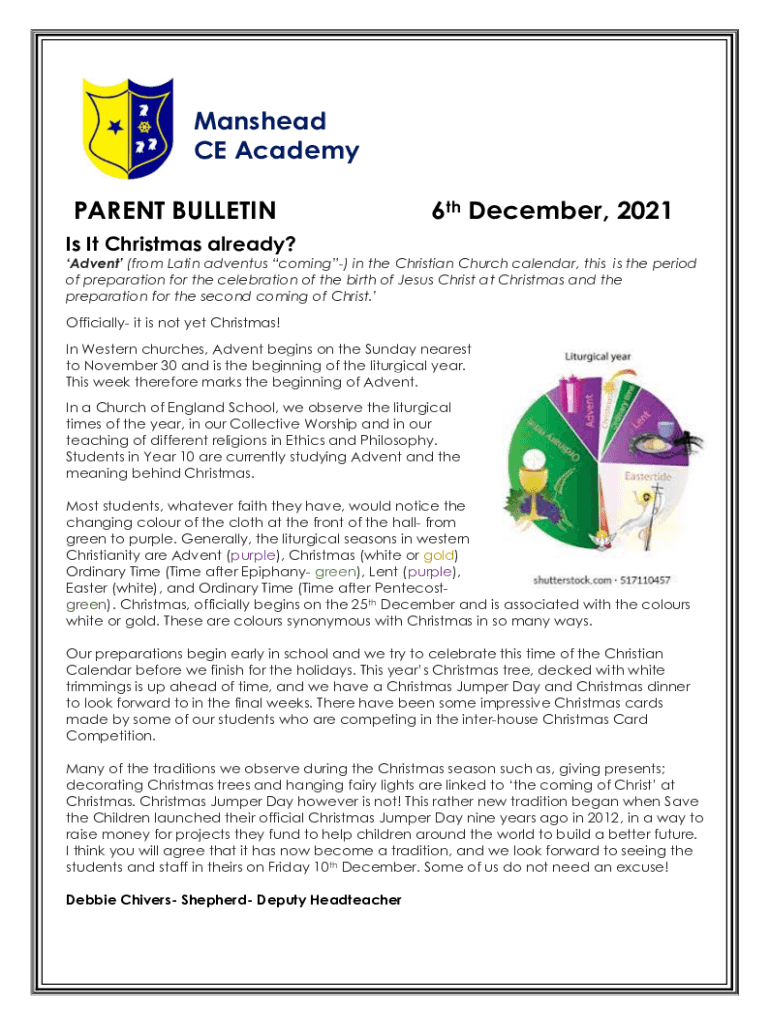 Men head CE Academy PARENT BULLETIN6th December, 2021Is It Christmas already? Advent (from Latin advents coming) in the Christian Church calendar, this is the period of preparation for the celebration