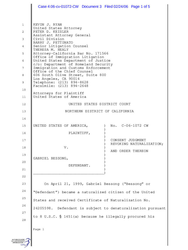 Case 4:06cv01072CW Document 3 Filed 02/24/06-Page 1 of 51 2 3 4 5 6 7 8 9KEVIN J. RYAN United States Attorney PETER D. KESSLER Assistant Attorney General Civil Division BARRY J. PETTING Senior Litigation