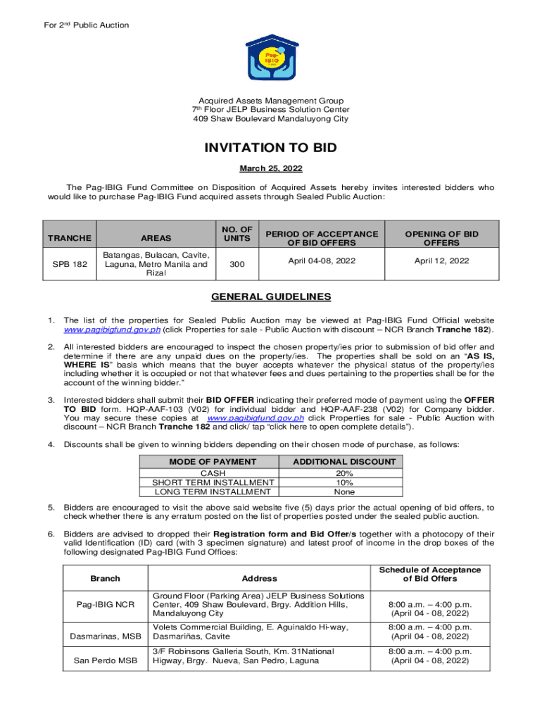 For 2nd Public AuctionAcquired Assets Management Group 7th Floor HELP Business Solution Center 409 Shaw Boulevard Mandaluyong CityINVITATION TO BID March 25, 2022, The Paging Fund Committee on Disposition