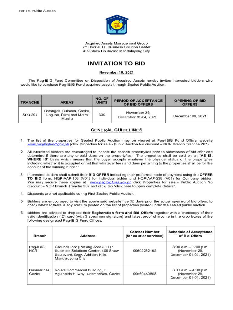 For 1st Public AuctionAcquired Assets Management Group 7th Floor HELP Business Solution Center 409 Shaw Boulevard Mandaluyong CityINVITATION TO BID November 19, 2021, The Paging Fund Committee on
