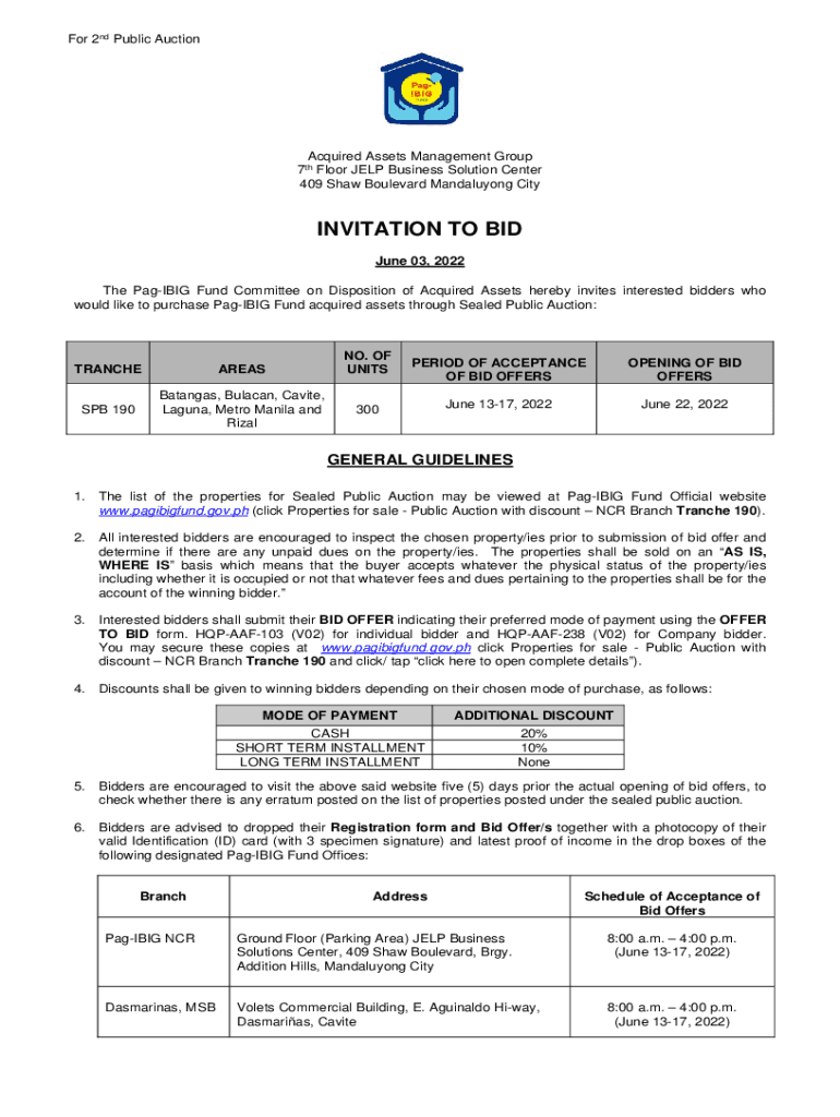 For 2nd Public AuctionAcquired Assets Management Group 7th Floor HELP Business Solution Center 409 Shaw Boulevard Mandaluyong CityINVITATION TO BID June 03, 2022, The Paging Fund Committee on Disposition