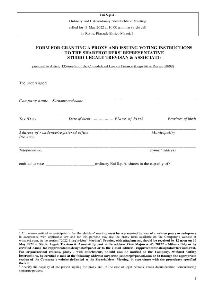 ENI S.p.A. Ordinary and Extraordinary Shareholders Meeting called for 11 May 2022 at 10:00 a.m., on single call in Rome, Piazza Enrico Matter, 1FORM FOR GRANTING A PROXY AND ISSUING VOTING INSTRUCTIONS