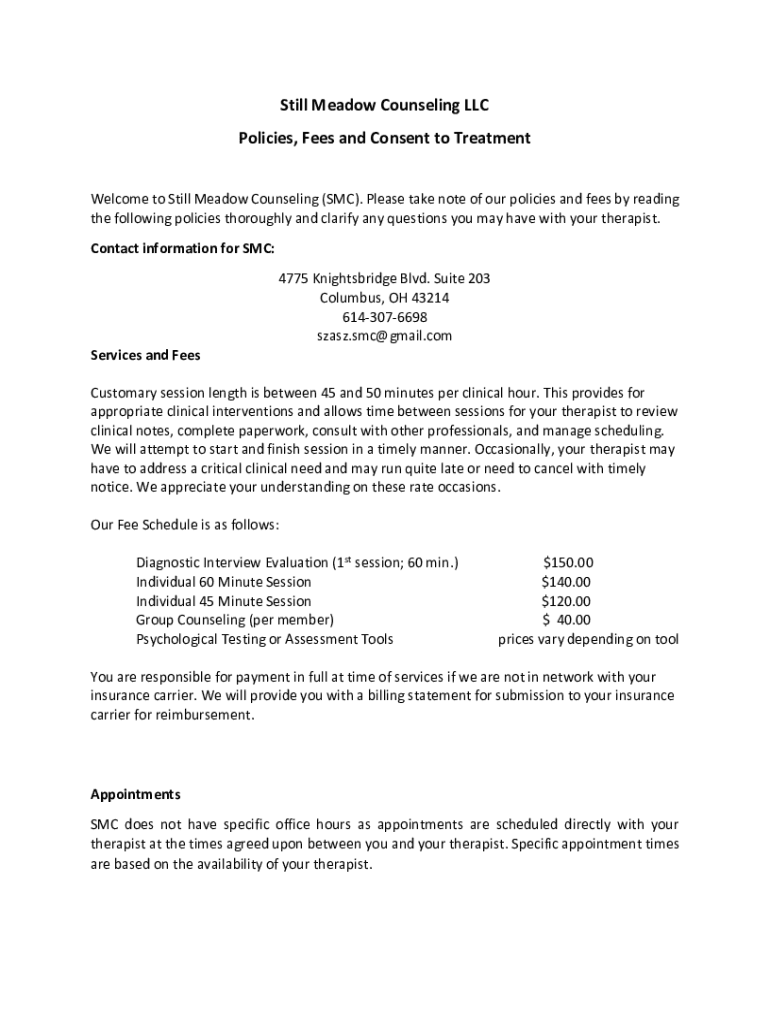 Still Meadow Counseling LLC Policies, Fees and Consent to Treatment Welcome to Still Meadow Counseling (SMC). Please take note of our policies and fees by reading the following policies thoroughly