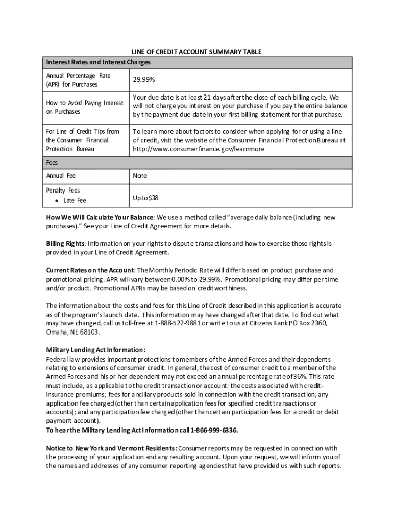 LINE OF CREDIT ACCOUNT SUMMARY TABLE Interest Rates and Interest Charges Annual Percentage Rate (APR) for Purchases29.99%How to Avoid Paying Interest on PurchasesYour due date is at least 21 days