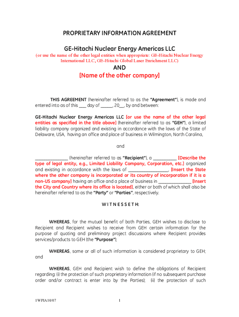 PROPRIETARY INFORMATION AGREEMENT GE Hitachi Nuclear Energy Americas LLC (or use the name of the other legal entities when appropriate: GE Hitachi Nuclear Energy International LLC, GE Hitachi Global