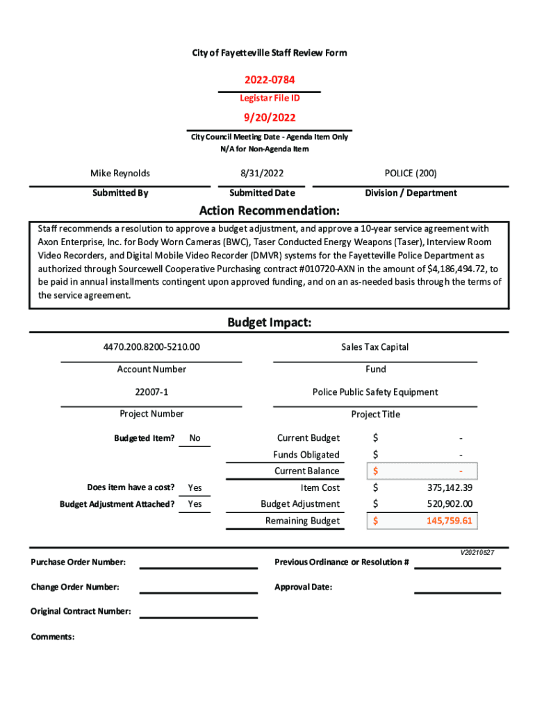 CityofFayettevilleStaffReviewForm20220784 LegistarFileID9/20/2022 CityCouncilMeetingDateAgendaItemOnly N/AforNonAgendaItemMikeReynolds8/31/2022POLICE(200)SubmittedBySubmittedDateDivision/DepartmentActionRecommendation: