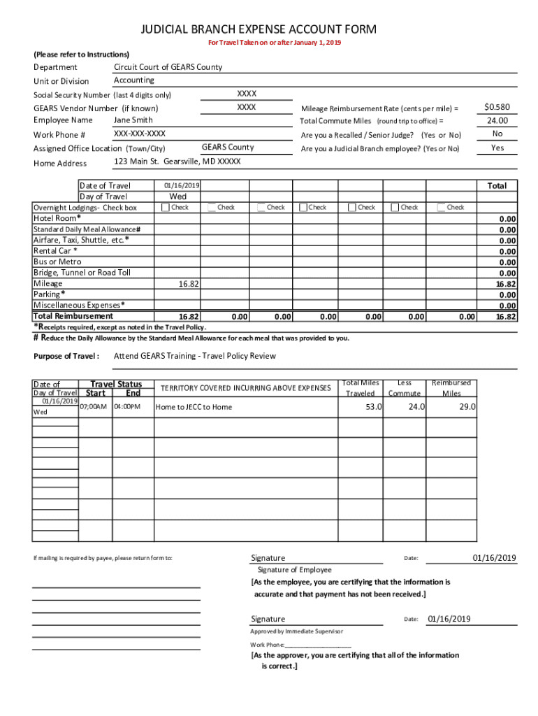 JUDICIAL BRANCH EXPENSE ACCOUNT FORM For Travel Taken on or after January 1, 2019(Please refer to Instructions)Department Unit or DivisionCircuit Court of GEARS County AccountingSocial Security Number