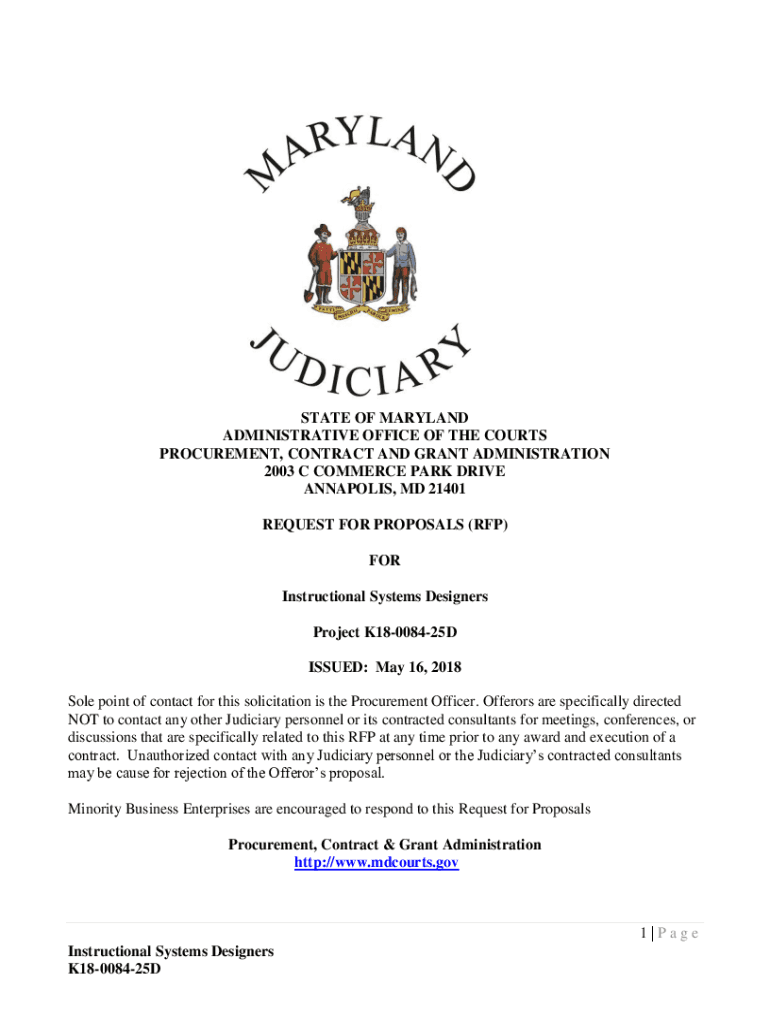 STATE OF MARYLAND ADMINISTRATIVE OFFICE OF THE COURTS PROCUREMENT, CONTRACT AND GRANT ADMINISTRATION 2003 C COMMERCE PARK DRIVE ANNAPOLIS, MD 21401 REQUEST FOR PROPOSALS (RFP) FOR Instructional Systems
