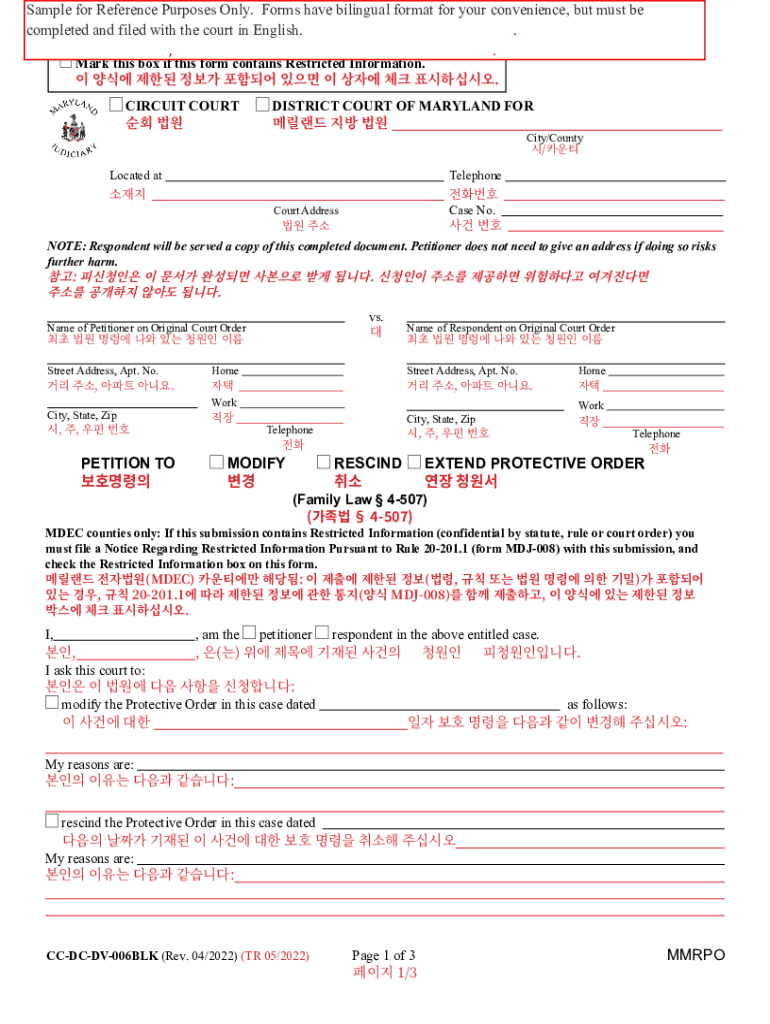 Sample for Reference Purposes Only. Forms have bilingual format for your convenience, but must be completed and filed with the court in English. . , Mark this box if this form contains Restricted
