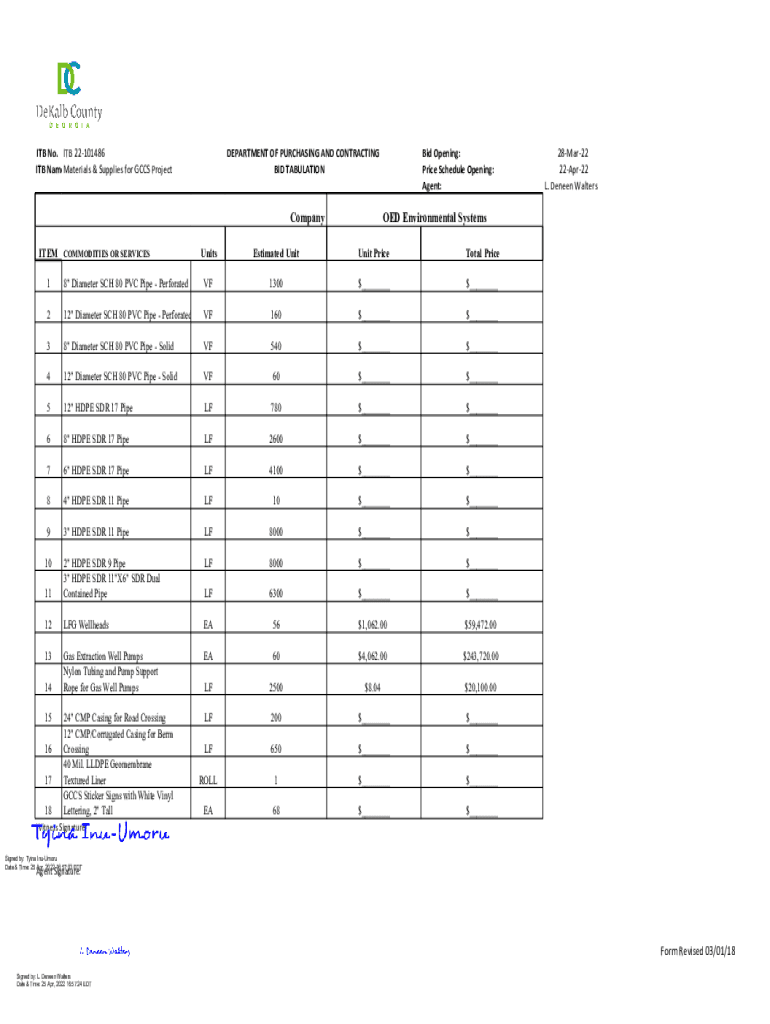 ITB No. ITB 22101486 ITB Name:Materials & Supplies for CCS ProjectDEPARTMENT OF PURCHASING AND CONTRACTING BID TABULATIONCompany ITEM COMMODITIES OR Services Opening: Price Schedule Opening: Agent:OED