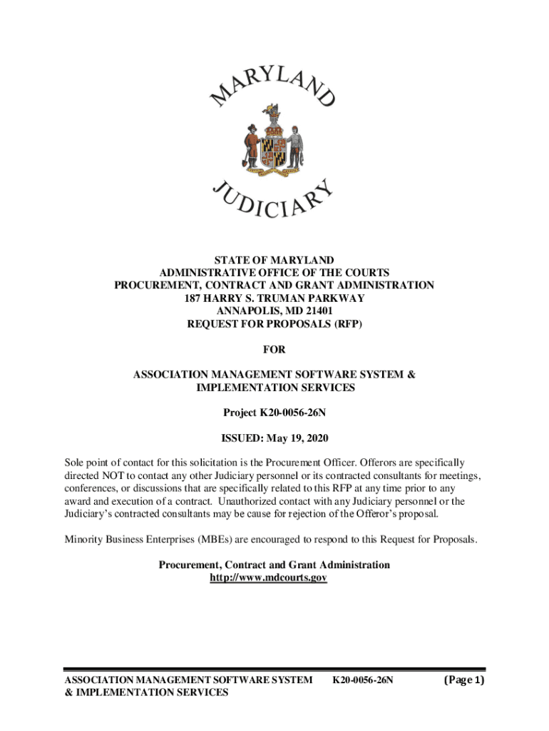 STATE OF MARYLAND ADMINISTRATIVE OFFICE OF THE COURTS PROCUREMENT, CONTRACT AND GRANT ADMINISTRATION 187 HARRY S. TRUMAN PARKWAY ANNAPOLIS, MD 21401 REQUEST FOR PROPOSALS (RFP) FOR ASSOCIATION MANAGEMENT