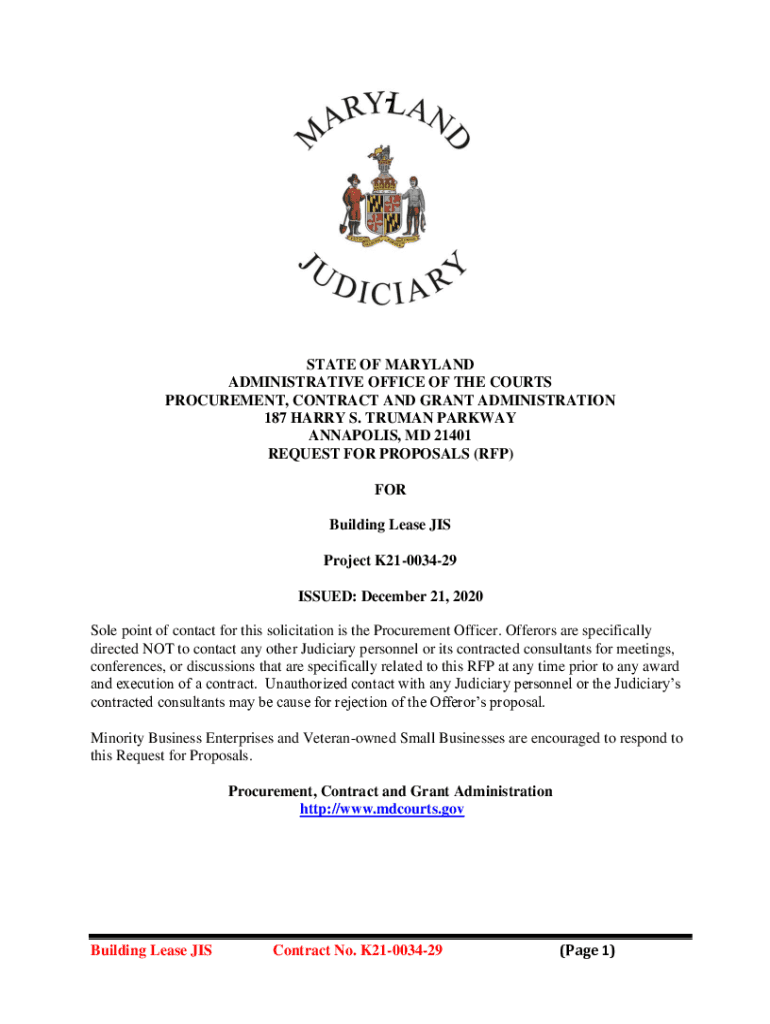 7STATE OF MARYLAND ADMINISTRATIVE OFFICE OF THE COURTS PROCUREMENT, CONTRACT AND GRANT ADMINISTRATION 187 HARRY S. TRUMAN PARKWAY ANNAPOLIS, MD 21401 REQUEST FOR PROPOSALS (RFP) FOR Building Lease