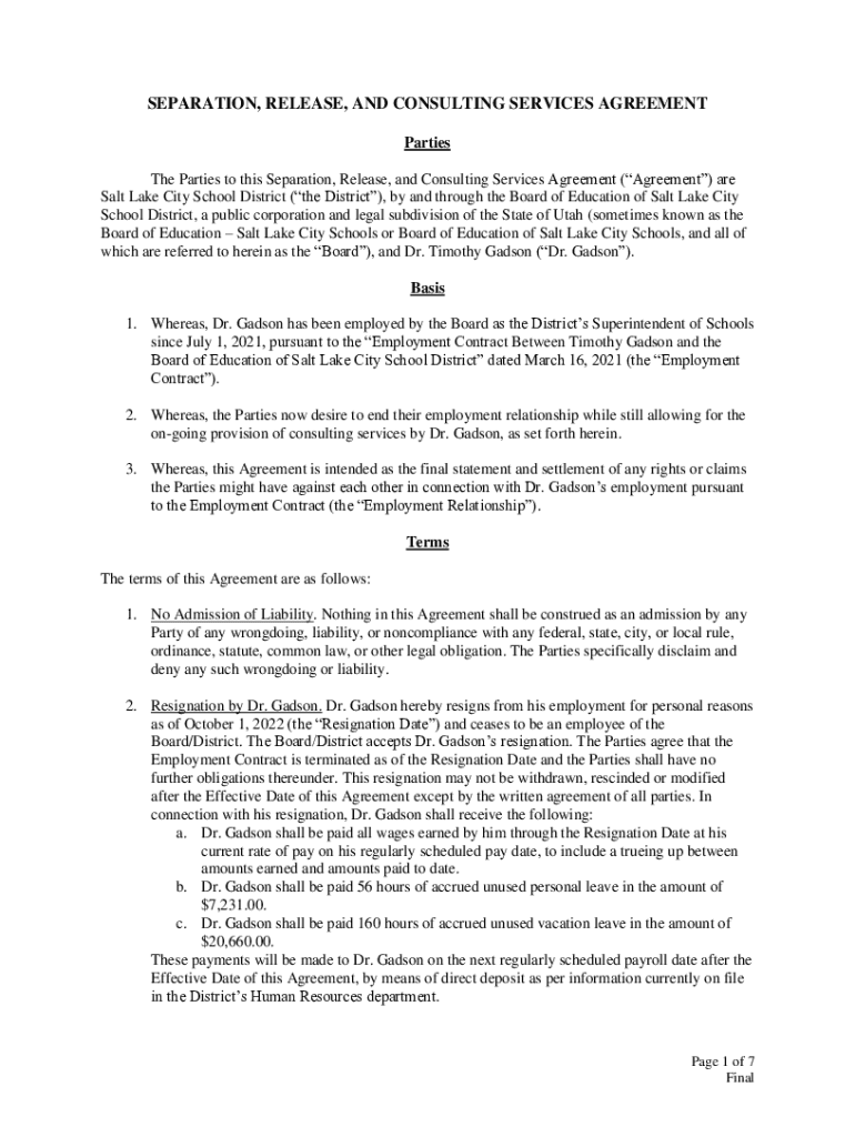 SEPARATION, RELEASE, AND CONSULTING SERVICES AGREEMENT Parties The Parties to this Separation, Release, and Consulting Services Agreement (Agreement) are Salt Lake City School District (the District),