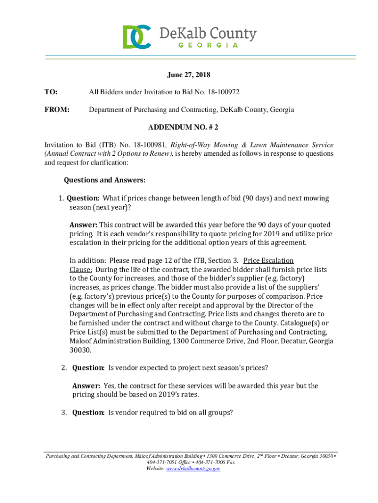 June 27, 2018, TO:All Bidders under Invitation to Bid No. 18100972FROM:Department of Purchasing and Contracting, DeKalb County, Georgia ADDENDUM NO. # 2Invitation to Bid (ITB) No. 18100981, RightofWay