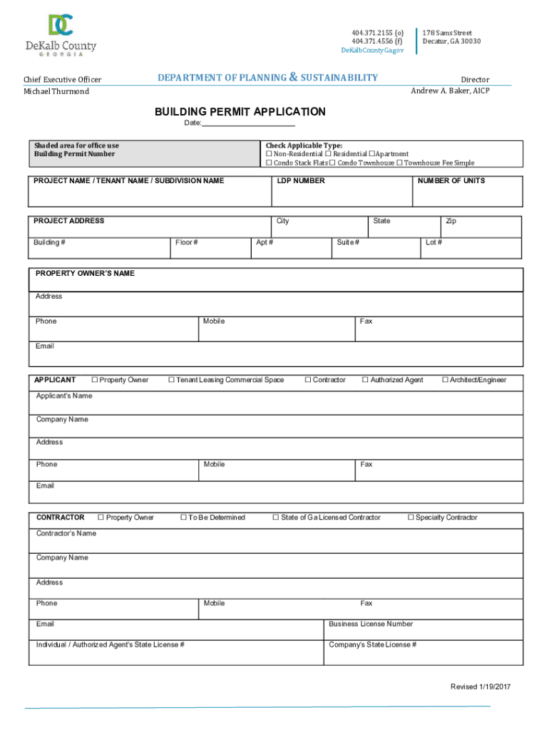 Submit the completed application form along with any required documents, such as building plans, fire safety certificates, and zoning approvals, to the Dekalb County Office of Planning and Sustainability.