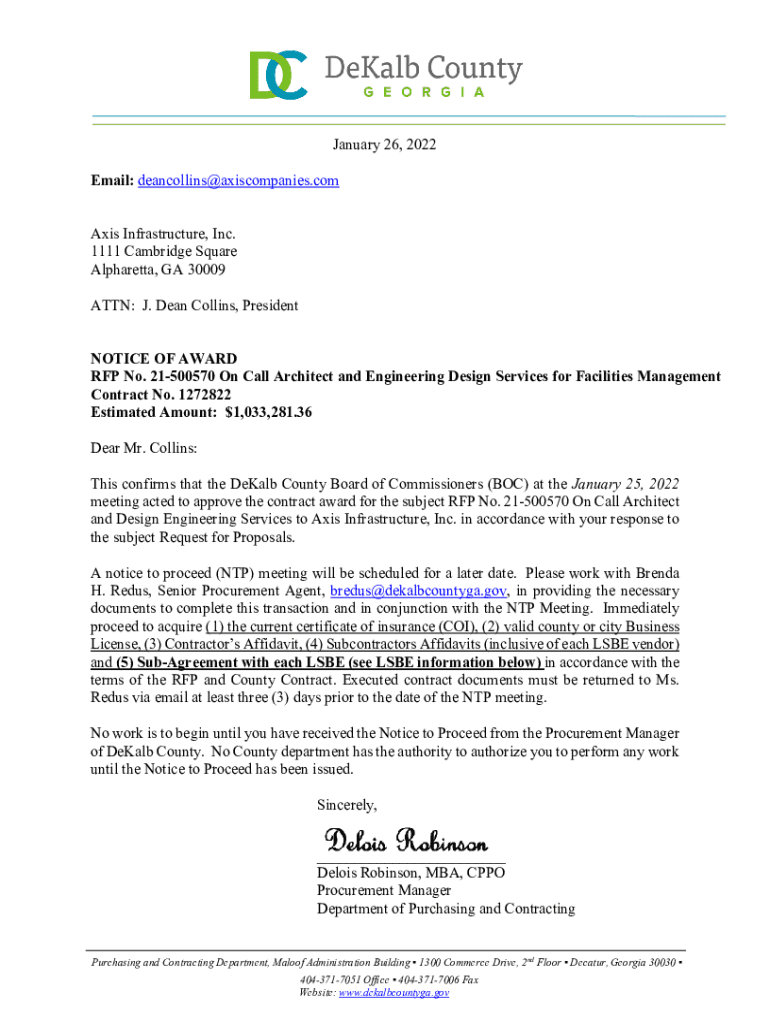 January 26, 2022, Email: deancollins@axiscompanies.com Axis Infrastructure, Inc. 1111 Cambridge Square Alpharetta, GA 30009 ATTN: J. Dean Collins, President NOTICE OF AWARD RFP No. 21500570 On Call
