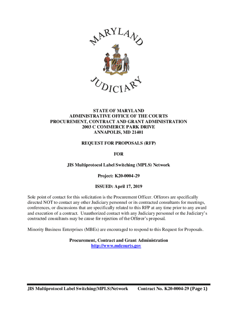 STATE OF MARYLAND ADMINISTRATIVE OFFICE OF THE COURTS PROCUREMENT, CONTRACT AND GRANT ADMINISTRATION 2003 C COMMERCE PARK DRIVE ANNAPOLIS, MD 21401 REQUEST FOR PROPOSALS (RFP) FOR IS Multi protocol
