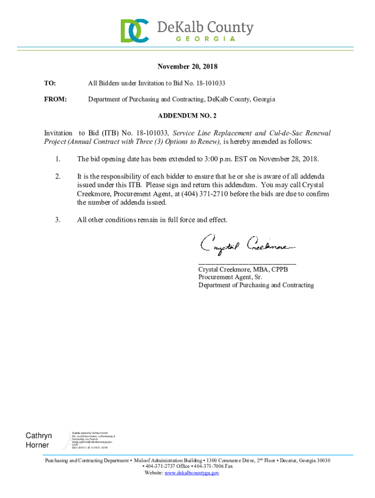 November 20, 2018, TO:All Bidders under Invitation to Bid No. 18101033FROM:Department of Purchasing and Contracting, DeKalb County, Georgia ADDENDUM NO. 2Invitation to Bid (ITB) No. 18101033, Service