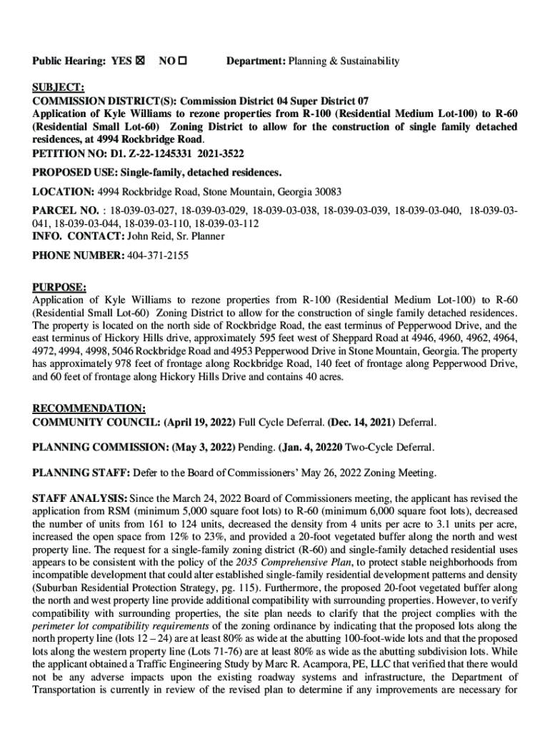 Public Hearing: YES NO Department: Planning & SustainabilitySUBJECT: COMMISSION DISTRICT(S): Commission District 04 Super District 07 Application of Kyle Williams to rezone properties from R100 (Residential