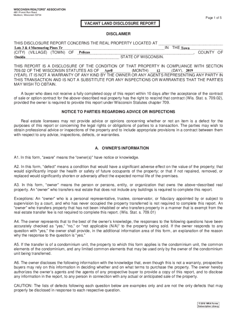 WISCONSIN REALTORS ASSOCIATION 4801 Forest Run Road Madison, Wisconsin 53704Page 1 of 5VACANT LAND DISCLOSURE REPORT DISCLAIMER THIS DISCLOSURE REPORT CONCERNS THE REAL PROPERTY LOCATED AT ___ ___IN