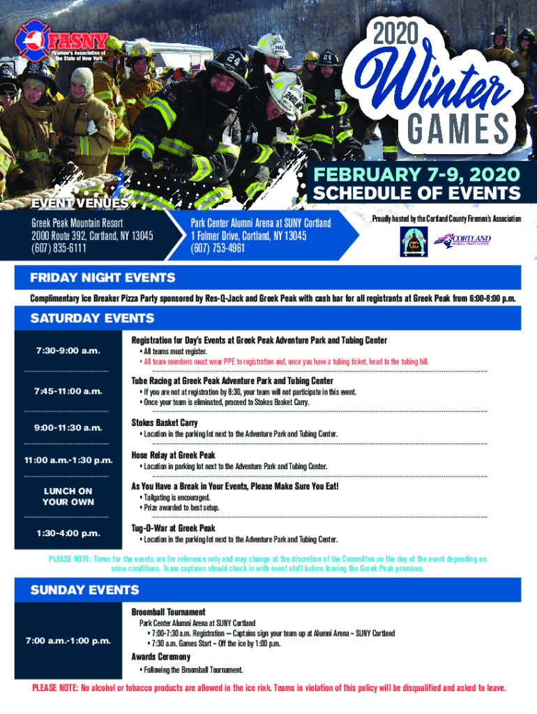 FEBRUARY 79, 2020SCHEDULE OF EVENTSEVENT VENUES Greek Peak Mountain Resort 2000 Route 392, Cortland, NY 13045 (607) 8356111Park Center Alumni Arena at SUN Cortland 1 Former Drive, Cortland, NY 13045