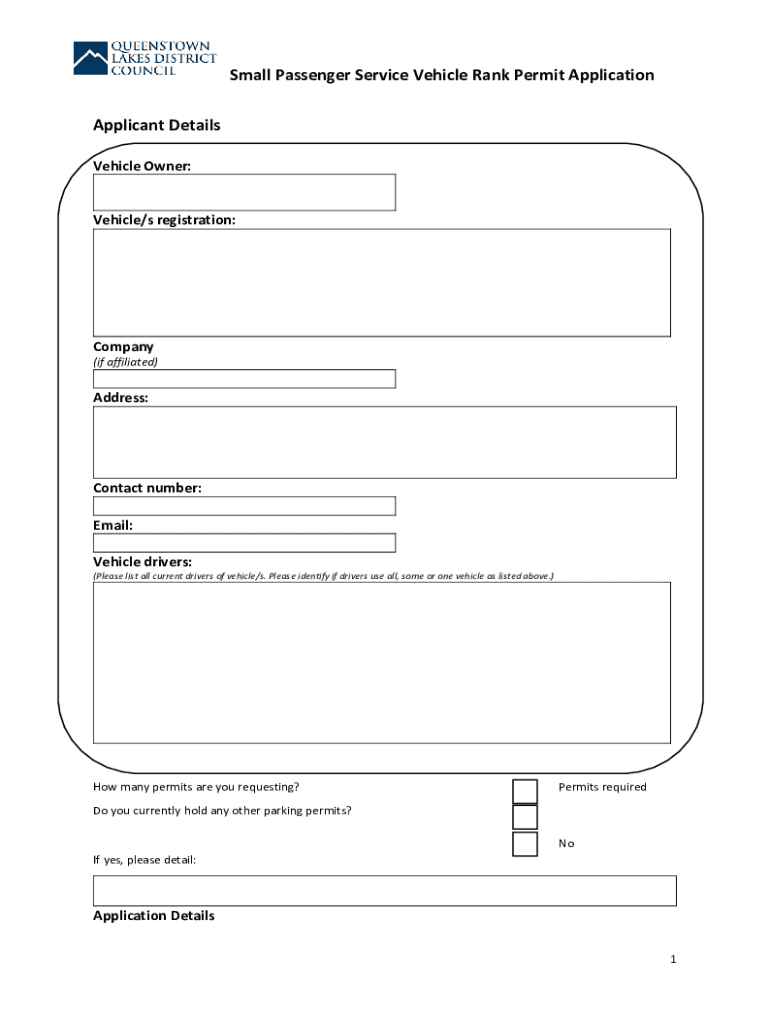 Small Passenger Service Vehicle Rank Permit Application Applicant Details Vehicle Owner: Vehicle/s registration:Company(if affiliated)Address:Contact number: Email: Vehicle drivers:(Please list all
