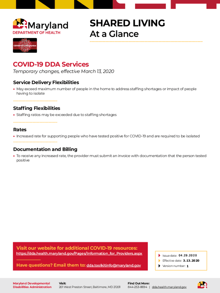 SHARED LIVING At a Glance ___ COVID-19 DDA ServicesTemporary changes, effective March 13, 2020, Service Delivery Flexibility May exceed maximum number of people in the home to address staffing shortages