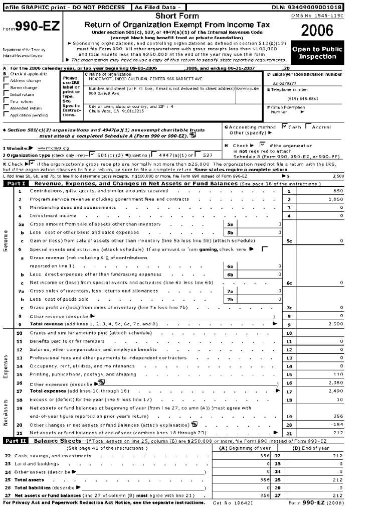 L efileFormGRAPHIC print DO NOT PROCESS990EZDepartment of the Treasury Internal Revenue Services Filed Data DAN: 93409009001018Short Form Return of Organization Exempt From Income Tax OMB No2006Under