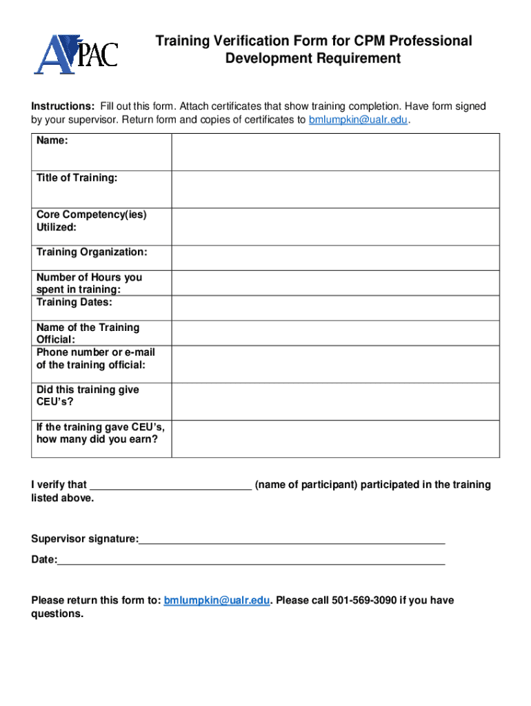 Training Verification Form for CPM Professional Development RequirementInstructions: Fill out this form. Attach certificates that show training completion. Have form signed by your supervisor. Return
