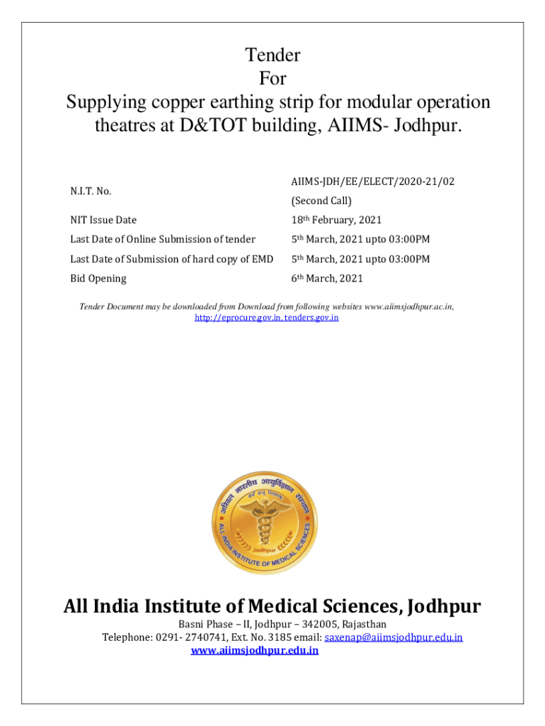Tender For Supplying copper earthing strip for modular operation theaters at DEPOT building, AIMS Jodhpur. N.I.T. No.AIIMSJDH/EE/ELECT/202021/02 (Second Call)NIT Issue Date18th February, 2021Last