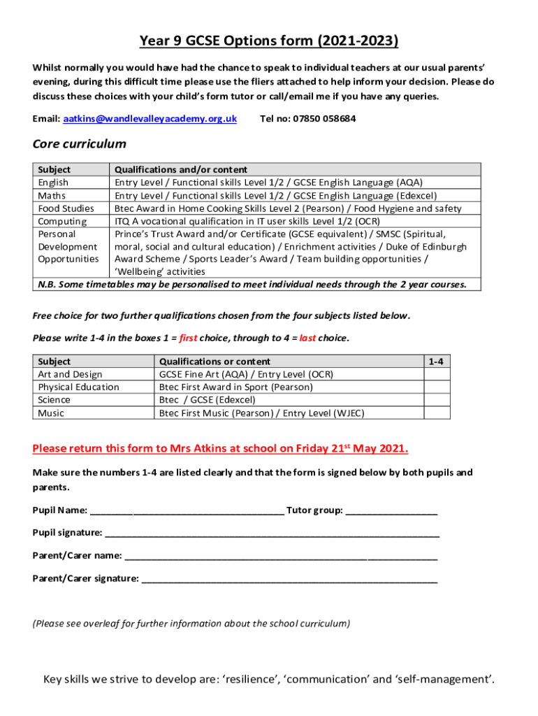 Year 9 GCSE Options form (20212023) Whilst normally you would have had the chance to speak to individual teachers at our usual parents evening, during this difficult time please use the fliers attached