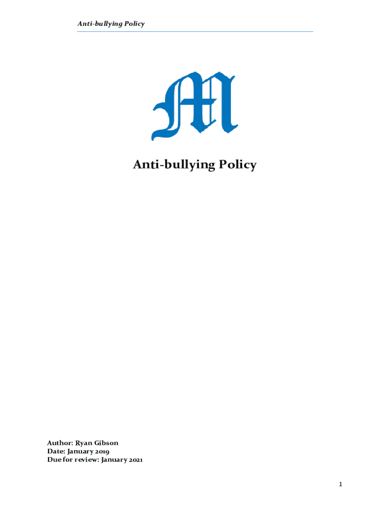 Antibullying PolicyAntibullying PolicyAuthor: Ryan Gibson Date: January 2019 Due for review: January 2021 1Contents Section 1 Principles behind this policy..................................................................................................