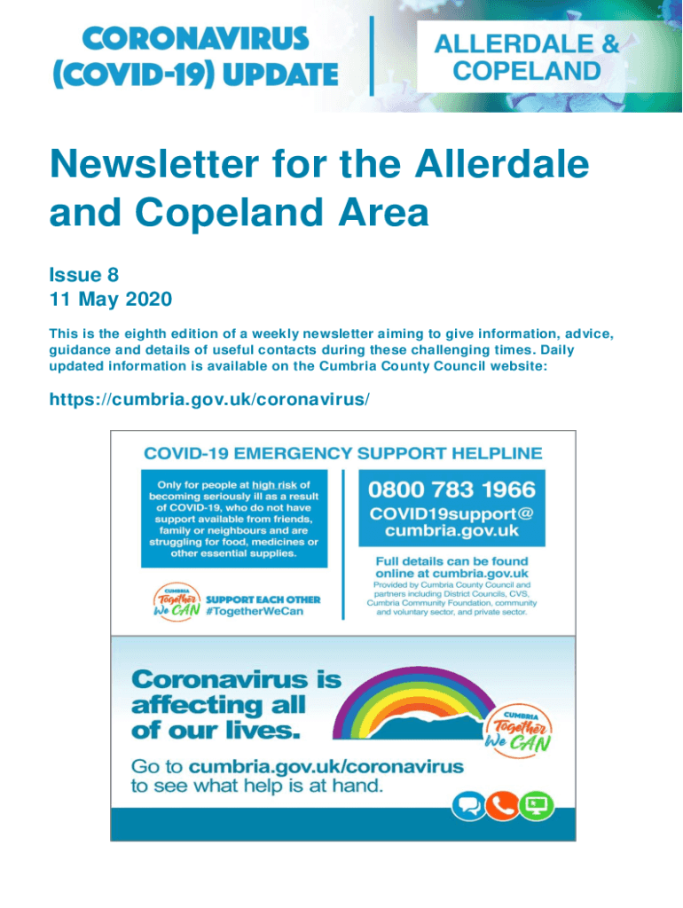 Newsletter for the Allerdale and Copeland Area Issue 8 11 May 2020 This is the eighth edition of a weekly newsletter aiming to give information, advice, guidance and details of useful contacts during