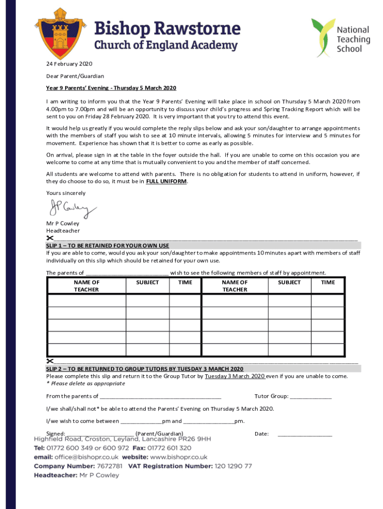 24 February 2020 Dear Parent/Guardian Year 9 Parents Evening Thursday 5 March 2020 I am writing to inform you that the Year 9 Parents Evening will take place in school on Thursday 5 March 2020 from