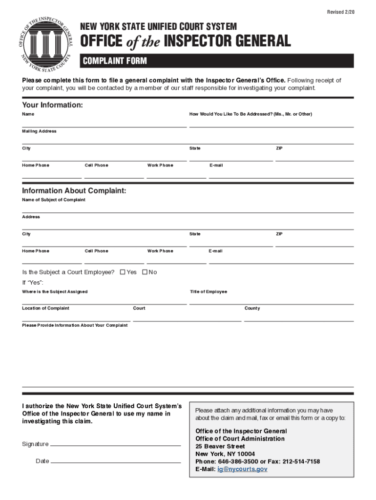 SHORTNESS AL NE OFFICE Revised 2/20 E INSPECTOR R TURKS T AT COUNTY YORK STATE UNIFIED COURT SYSTEMOFFICE of the INSPECTOR GENERAL COMPLAINT Formulas complete this form to file a general complaint