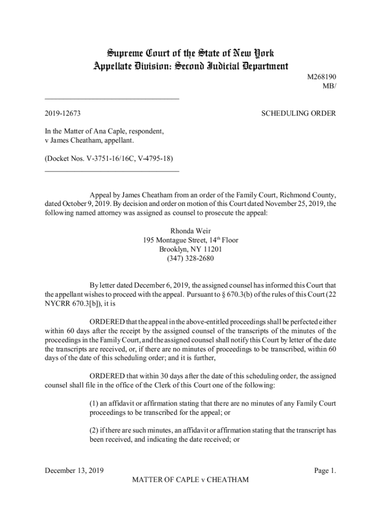Supreme Court of the State of New York Appellate Division: Second Judicial Department M268190 MB/ ___ 201912673SCHEDULING Ordering the Matter of Ana Cable, respondent, v James Cheatham, appellant.