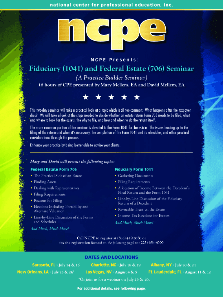 N a t ion an l c e n t e r for professional education, inc. NAPE Presents:Fiduciary (1041) and Federal Estate (706) Seminar (A Practice Builder Seminar) 16 hours of CPE presented by Mary Miller, EA