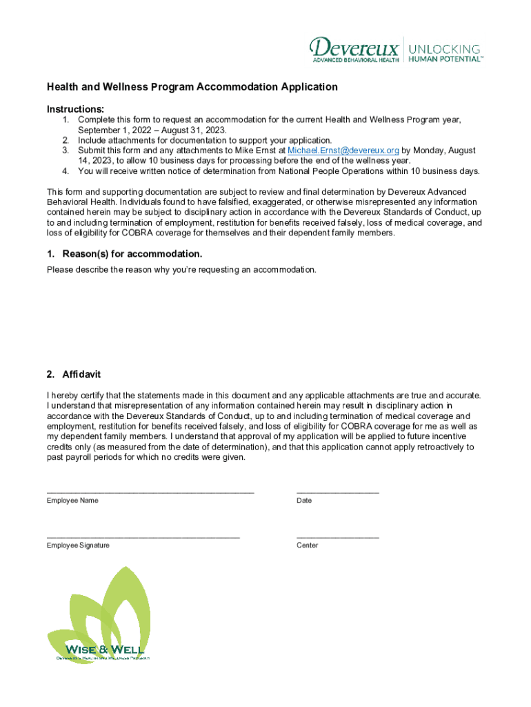 Health and Wellness Program Accommodation Application Instructions:1. Complete this form to request accommodation for the current Health and Wellness Program year, September 1, 2022, August 31, 2023.