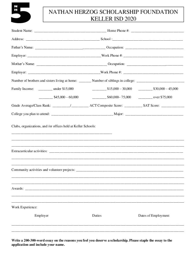 NATHAN HERZOG SCHOLARSHIP FOUNDATION KELLER ISD 2020 Student Name: ___ Home Phone #: ___ Address: ___ School :___Due Date: Fathers May Name: 2nd ___ Occupation: ___ Employer: ___Work Phone #: ___