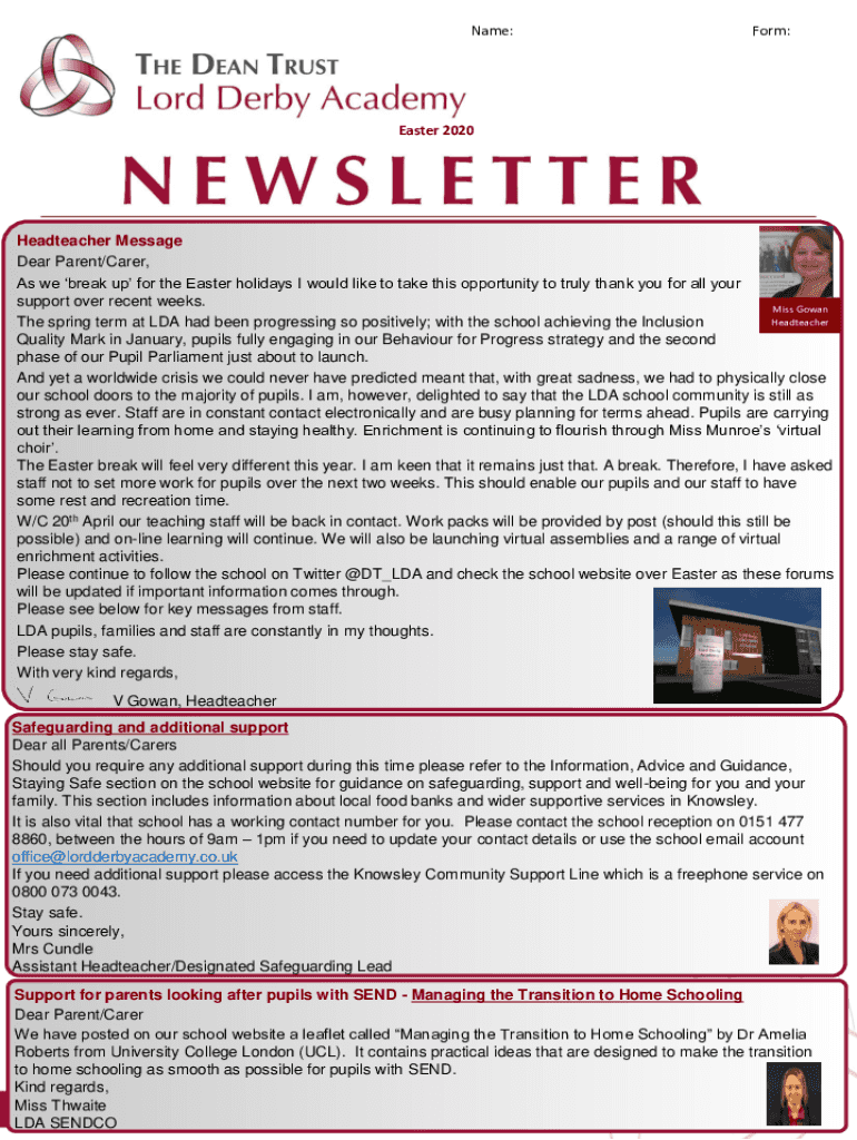 Name:Form:Easter 2020Headteacher Message Dear Parent/Carer, As we break up for the Easter holidays I would like to take this opportunity to truly thank you for all your support over recent weeks.