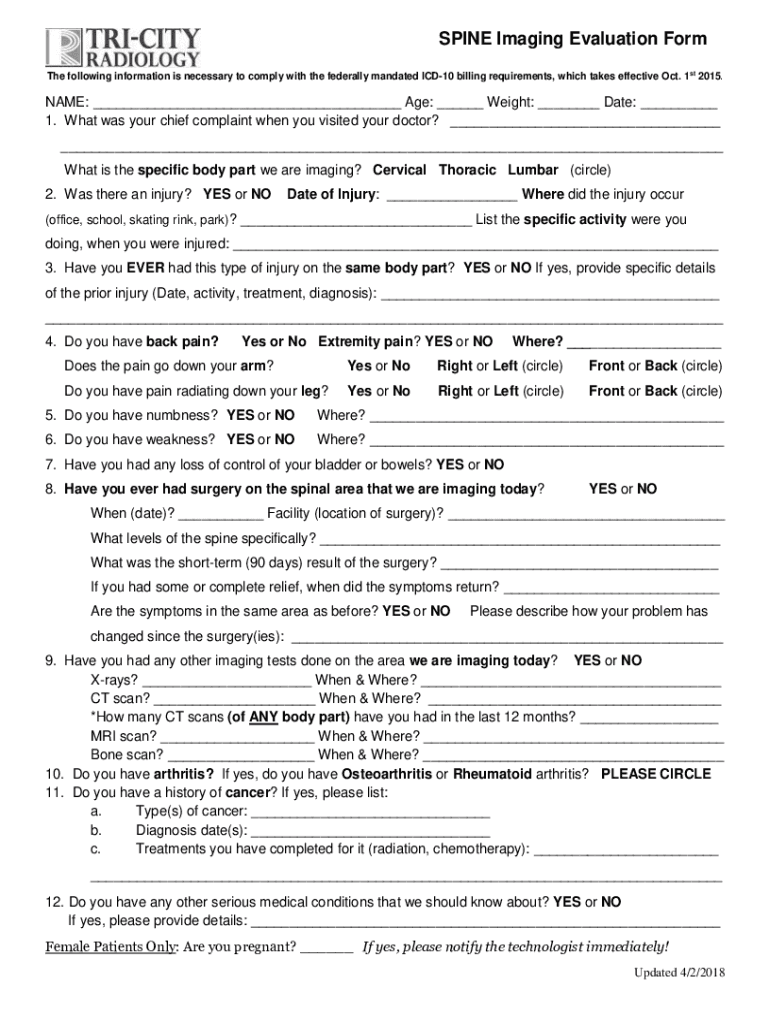 SPINE Imaging Evaluation Form The following information is necessary to comply with the federally mandated ICD10 billing requirements, which takes effective Oct. 1st 2015.NAME: ___ Age: ___ Weight: