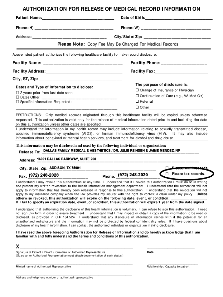 AUTHORIZATION FOR RELEASE OF MEDICAL RECORD INFORMATION Patient Name:___ __ ___Date of Birth:___ ___Phone: H) ___Phone: W) ___Address: ___City/State/Zip: ___Please Note: Copy Fee May Be Charged For